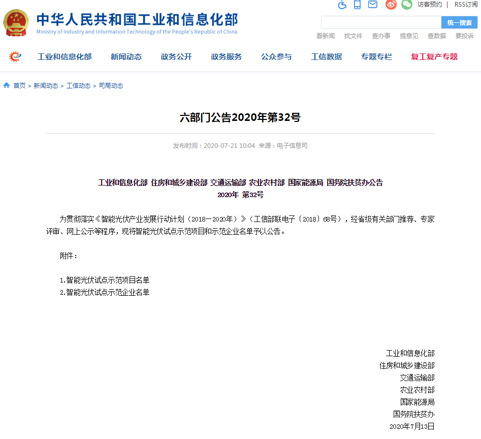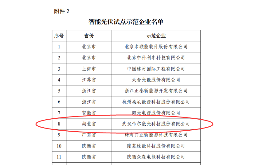 2020年7月21日,國家工業(yè)和信息化部、住房和城鄉(xiāng)建設(shè)部、交通運(yùn)輸部、農(nóng)業(yè)農(nóng)村部、國家能源局、國務(wù)院扶貧辦六部門發(fā)布2020年第32號公告,確定智能光伏試點(diǎn)示范項(xiàng)目和示范企業(yè)名單,帝爾激光入選智能光伏試點(diǎn)示范企業(yè),一同入選的還有隆基股份、天合光能、華為技術(shù)等企業(yè)。公告參見國家工信部網(wǎng)站信息。
